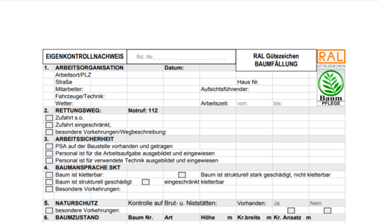 Die Gütebestimmungen für die Baumfällung, wie Schnitttechnik, Qualifizierung fürs Rigging, Qualität der Riggingausrüstung, werden von unabhängigen Prüfern und durch Führung dieses Eigenkontrollnachweises sichergestellt.